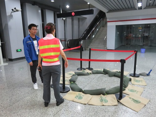 本次演練主要模擬某日運營期間花橋站站廳東側付費區上方水管爆管,導致站廳東側付費區有滲水及積水現象,并且積水面積不斷的擴大,已影響到車站正常運營。車站工作人員通過使用沙袋、阻水袋等進行前期除水防護及客流組織工作,行車值班員做好相應的報修及信息匯報工作。最后,在搶修人員到達車站進行現場應急處置完畢后化解此次車站爆管危機。