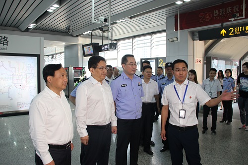 9月26日下午,蘇州市委常委、政法委書記徐美健帶隊督導檢查軌道公司兆豐路站新中國成立70周年大慶安保維穩工作,市領導張月林、魏杰陪同視察。